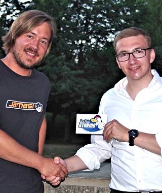 Sponsoringbeauftragter Fabian Mieloch (l.) bedankte sich in Chemnitz persönlich bei Sascha Franz (floorballshop) für die exzellente Zusammenarbeit in den letzten Jahren