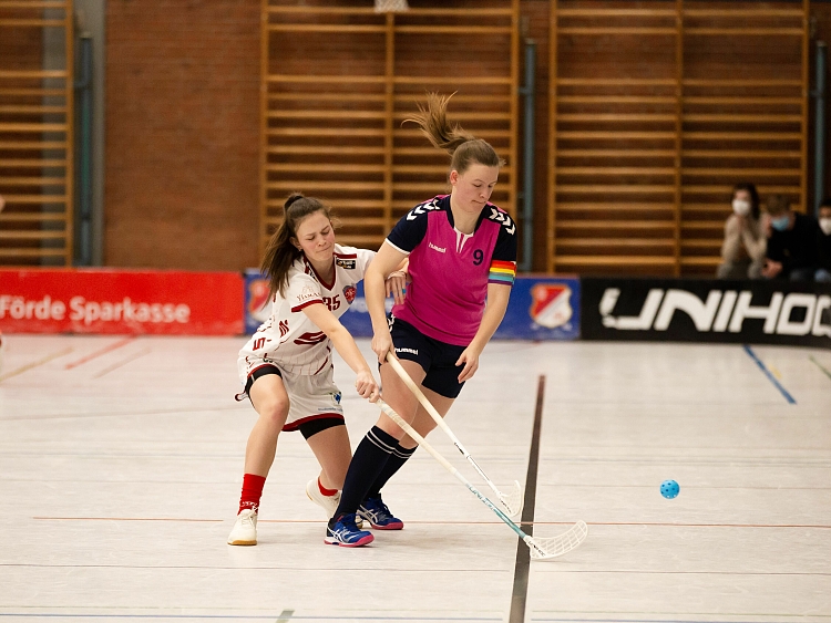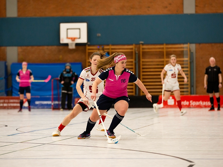 Die Aufholjagd ließ jedoch vergeblich auf sich warten. Im letzten Drittel schossen erst die Weißenfelserinnen das 0:10, bevor die Förde Deerns endlich die Katze aus dem Sack ließen. Mit einem gezielten Ball durch die Mitte bedachte Melanie Stöcks die freistehende Liesa Rathje im Slot. Rathje verwandelte dann ihren eigenen Abpraller zum ersten Tor für die Mädels von der Küste. Kurz darauf gab es im gegnerischen Team Schwierigkeiten beim Zählen, was den Deerns ein erneutes Powerplay aber dennoch keine weiteren Tore verschaffte. In der letzten Spielminute fielen dann noch zwei Tore durch den UHC – in beide Tore. Damit lautete der Endstand 2:11, was aus Sicht der Förde Deerns deutlich zu hoch ausfiel. Für die Kielerinnen hieß es nun „Frust runterschlucken, Kopf hoch und aus den Fehlern lernen“. Vielleicht klappt es ja im nächsten Duell mit der Aufholjagd, dieses Spiel blieb bedauerlicherweise ein Déjà-vu. Wir wünschen dem UHC Sparkasse Weißenfels dennoch viel Erfolg im Final4 und vor allem, dass es dieses Jahr endlich wieder stattfinden kann!