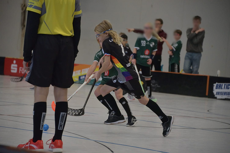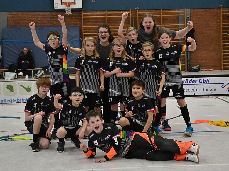 Zwischen zwei gleich starken Mannschaften entwickelte sich schnell ein spannendes Match. Die Führung wechselte hin und her und mit den Toren von Naphat, Leif, Lolle und Loran ging es mit 4:3 in die Pause. Danach konnte Flensburg durch drei Toren in zwei Minuten die Führung erneut drehen bevor eine Jungmöwe zum 5:6 Anschluss einlochte. Auch Michel und Constantin verzeichneten Treffer und der Vorsprung war wieder auf unserer Seite. Zum großen Jubel der Flensburger Fans genügte aber eine kleine Unachtsamkeit und der PSV glich 14 Sekunden vor Schluss aus. Nun hieß es Verlängerung und sudden death. In der Regel beginnt man diese Phase etwas ruhiger, um ja nicht den ersten Fehler zu machen und dem Gegner eine Chance einzuräumen. Nicht so Lolle: ein beherzter Schuss - TOR! Und damit Sieg für die Storms! Herzlichen Glückwunsch!